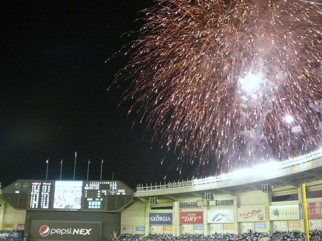 5回終了後交流戦花火は風向きの影響でライトスタンド後方から‥