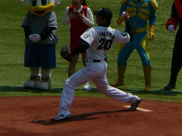 始球式は 薮田と里崎のバッテリーでした・・薮田 引退当時はほとんど投げず痛々しかったのが今日は100キロ越え・・ 2球目は岡田にはじき返されるもちょっとうれしかった・・