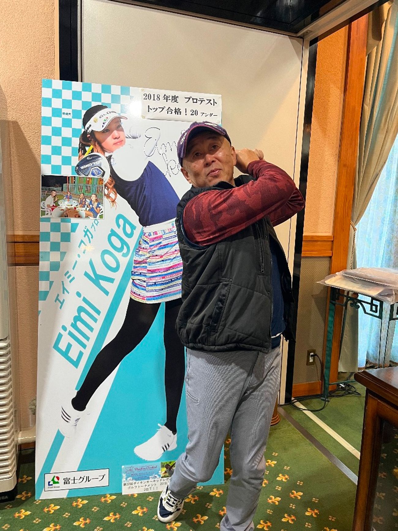 着膨れした初老オヤジが悪ノリして、当時10代でまだアマチュア時代の初々しかった頃に作成された原英莉花のレプリカの前で、スイングの真似をしてみました。
