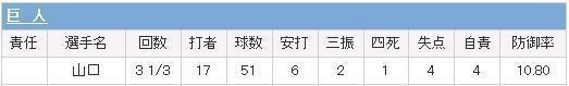 ◆広島5─6巨人(3日・マツダスタジアム) 巨人は救援から転向した山口が初先発したが、4回途中4失点でKOさ れた。「腕を振っていこうと思ったがバラバラ。変化球の切れもなく、その辺が次の課題」と、ほろ苦い「デビュー戦」となった。
