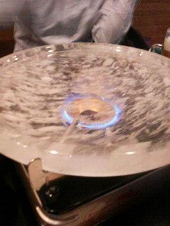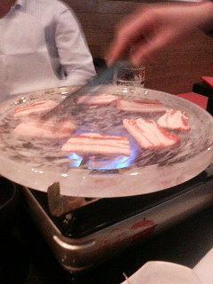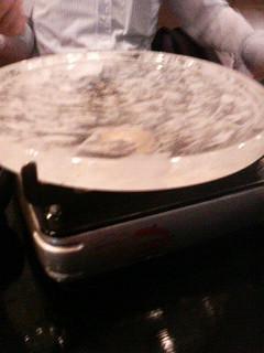 店内に入り、焼肉をオ−ダ−すると何やら見慣れない鉄板ではないものがコンロにセッティングされていました(注:画像)それは何と水晶で出来た鉄板(水晶・呼び名が難しい)でした。お店の方に聞くと、肉は美味しく焼け、しかもマイナスイオンが発生し体に良いとの事でした。(本当かなと思いながらも)確かに、見てくれも良いし&焦げない!