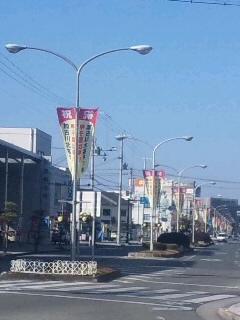 こちらは駅から市役所方面へ向かう道。こういうフラッグが市役所前まで約800mにわたって掲げられていました。市役所も全面バックアップということでしょうか。