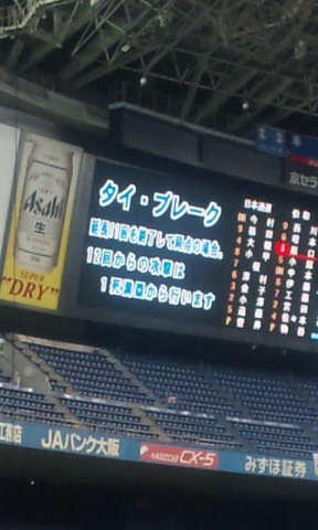 野球ネタです。仕事帰りに京セラドームに来ました。9回に1点ずつを取り合って延長です(T_T)