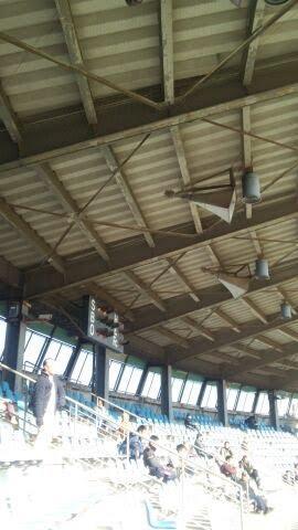 外観だけでよいかなあと思っていましたが、球場でなにやらやっているような声がします。スタンド入口が開放されています。