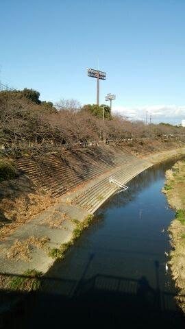 (ラグビー場と球場の間には川が流れています。たぶん川岸は桜並木なのでしょう)