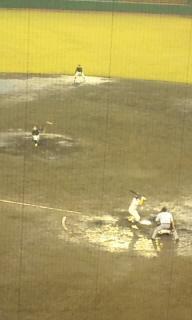 代打攻勢3人目・加治屋が1ストライク3ボールからフォアボールを選ぶ。打順トップに還って加藤がしぶとく三遊間をゴロで抜くヒットで続くと、なんとなく雰囲気があやしくなってきた。試合開始前から降り続いてきた雨もここへきて激しさを増したような気がする。マウンド上は8回二死から代わった左腕・井藤だが、続く2番打者にもフォアボールで満塁。ここで新薬は投手を加藤に交代。投球練習を見たところ右のサイドスローだった。もしこいつがストライク入らなかったらどうするんだろ。