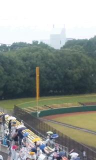 結局この試合唯一の得点は新薬の3番・箸尾谷の放ったソロホームランだった。飛距離は十分。レフトはポールの外だとアピールしていたようだが判定はホームラン。ネット裏上段、やや三塁側よりに座っていたので正面ではないが(むしろ横)、打球の方向と勢いからして切れなかったのではないか。右打者だったし、センターの旗を見ると風もなかった。スコアメモを見返すと日本新薬は3塁を踏んだのは実はこの1度だけ。8安打に8四死球でむしろ塁上をにぎわしたのはかずさだったが攻めきれず、雨中の一発に泣いた。