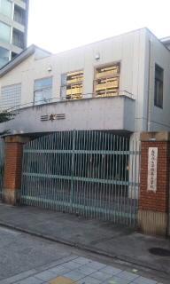 (画像2枚目。校門の中の建物は同窓会館。校章にも三本ラインが描かれている)