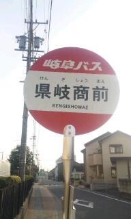 そうこうしてる間に学校の校舎らしい建物が見えてきた。まず市立の中学校。それを過ぎるとその先に県立岐阜商がある。この辺り、文教地区というのだろうか、学校の集まるエリアになっている。前日の大垣日大には人影が見えなかったが、この日は構内の自転車置き場などに部活の子たちの姿がちらほら見られた。門の近くにバス停があったので撮ってみる。