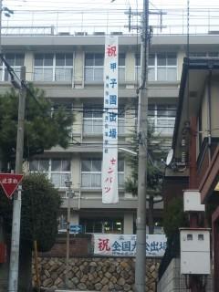 坂の突き当たりに門があり、甲子園出場の垂れ幕が遠くからもよく見えます(写真もちょっと遠いです)。地図でだいたいの見当はつけていましたが、住宅やマンションに囲まれたこぢんまりとした校地です。さすがにここで運動部を全部まかなうのは手狭なので、六甲山系の裏側にグラウンドを持っているとのこと。