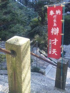 参道の急な石段にのぼりが立っています。弁の字がどっかで見たことのある字になっていますね。お察しの通り、智弁学園の「辯」は弁天さまの弁なのです。PL、天理が宗教系の学校として名高いのに比べ意外に知らない人もいるようです。