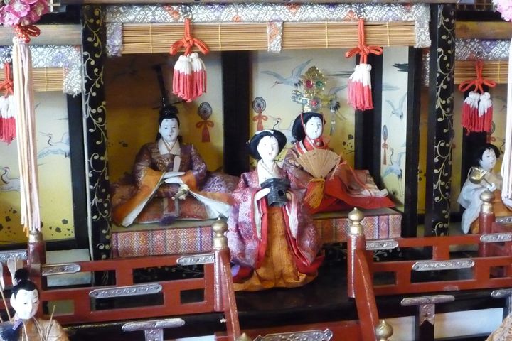 こちらは昭和初期ごろのおひなさまだそうです。人形の数は段飾りに比べて少ないですが、調度品が細かく再現されています。今日は一部施設で筝の演奏もあり、歴史を経た建物の中で美しく飾られた雛飾りとともに、来場者の目と耳を楽しませていました。