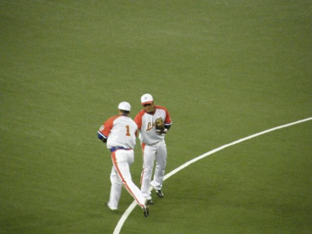 さて試合は、この写真の二人、背番号1と3の王、長島いや秋山、清原?を思わせる栗山、中島の活躍により快勝!!