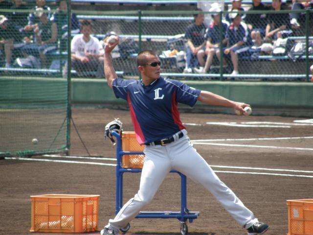 まず、試合前に驚いたのが写真の男。 そう、「投げる金剛力士」 石井貴2軍投手コーチです。 なんとフラフラ現れたかと思えばバッティングピッチャーをやり始めました。 現役時代を思い出しちゃいました。