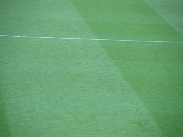 今朝の雨が嘘のよう。太陽を浴びて緑色に輝くグランド。