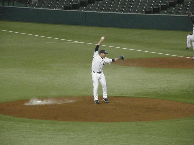 3回のマウンドに上がったのはシコースキー。この寒いのに半袖。。。 ライオンズのユニフォームでも腕グルグルを見せてくれました。 力強い投球でしっかりと中継ぎで活躍してくれそうでした。
