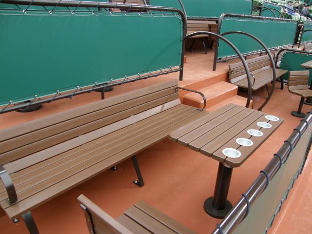 新設されたダッグアウトテラス席を間近で見てきました。 家族での観戦に最適ですね。 中段におトイレや売店、Lsダイニングと言う軽食も楽しめる場所も新設されお年寄りにも優しく、メジャーチックな楽しめる球場に生まれ変わりました。 フィールドビューシートは4月28日に体験予定です!