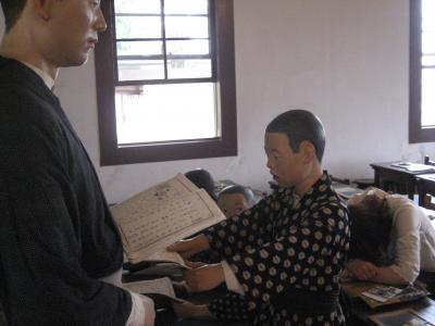 中には昔の授業風景を人形や机・いすを置いて再現されていて私たちもそこへ座って体験することができました。