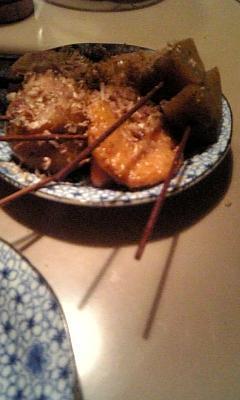 味はでもgoodでしたo(^ー^)o。じゃがいもとか糸こんとか黒はんぺんおいしかったのですが牛すじをたのんだところ「ごめんねーお肉屋さんも今日からだったから少ししかなくって、牛すじもううりきれちゃったー」と言われてしまいしょうがないので他のものを突っついてました。