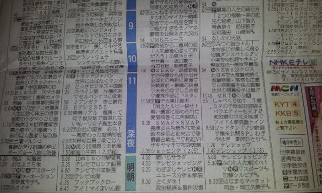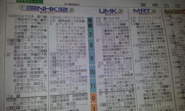 ちなみに、宮崎でまず観光客が驚くのが、テレビチャンネルが4つしかありません。うち2つがNHKなので、実質的に2つしかないです。新聞のテレビチャンネルは、こう表示されます。(((^_^;)