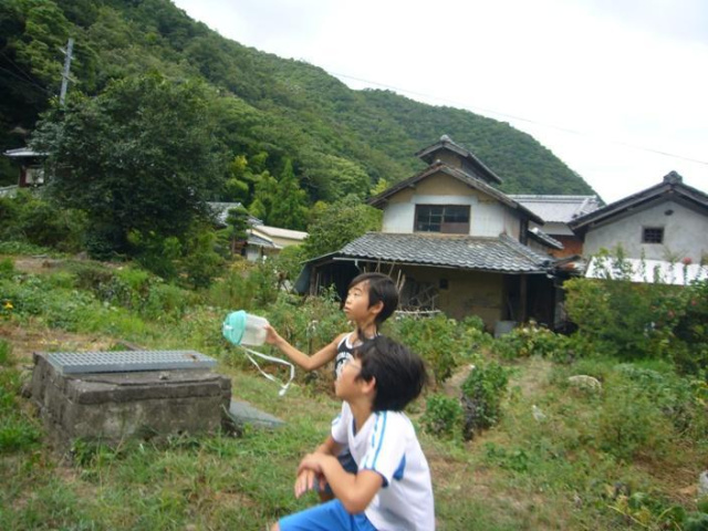 写真は、図鑑で種類を調べた後逃がしているところです。