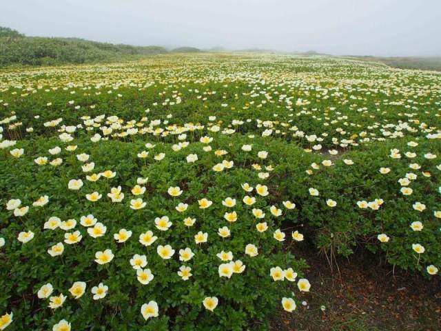 一面の花畑、晴れてたらガスの奥に旭岳が・・・・