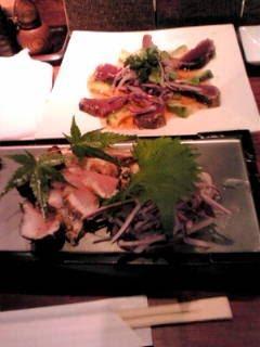 宮崎の夕食カツオのたたきマリネ風宮崎地鶏など