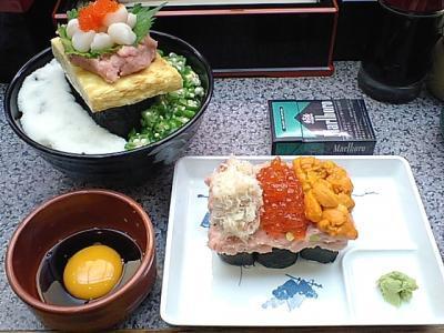 上に太巻きが2つ…さらに卵を挟んでネギトロに