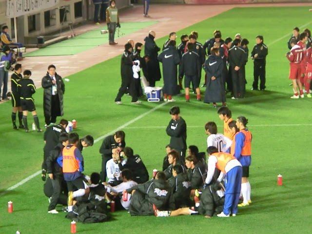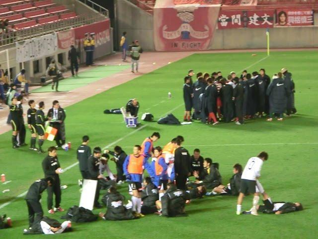 アントラーズのメンバーが全員立ってミ-ティングするなか、座りこむカターレ富山の選手たち