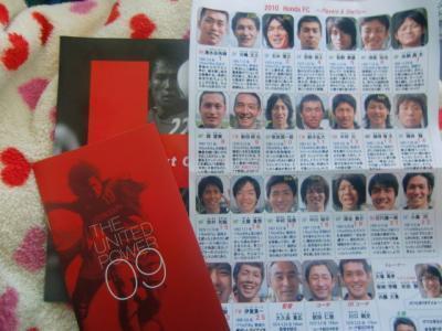 すると、Honda FCサポーターのお姉さんが、Hondaサイドに座っていた見学者全員に、一昨年・昨年とスタジアムで売られていたオフィシャルガイド(各200円するもの)と、お姉さんが作ったとおぼしき2010選手ガイドを配布してまわってくれました。