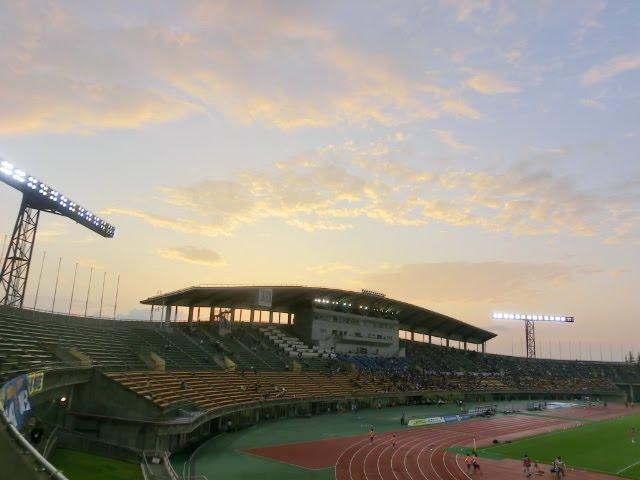 前半34分 メインスタンドから差し込む富山県総合陸上競技場の夕陽