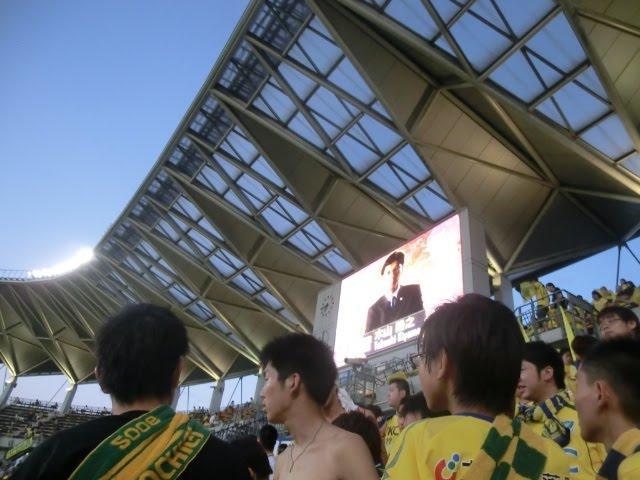 ジェフ千葉さんのスタジアムDJさんたち?を乗せたバスがスタジアムに乗りつけた映像がビジョンに映るなか