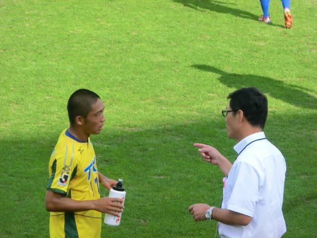 試合の途切れた合間に河原くんに指示を伝える松田監督
