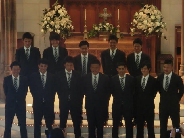 岡田翔平選手が一人だけみんなの前に出てきてセンターの位置に付き(笑)