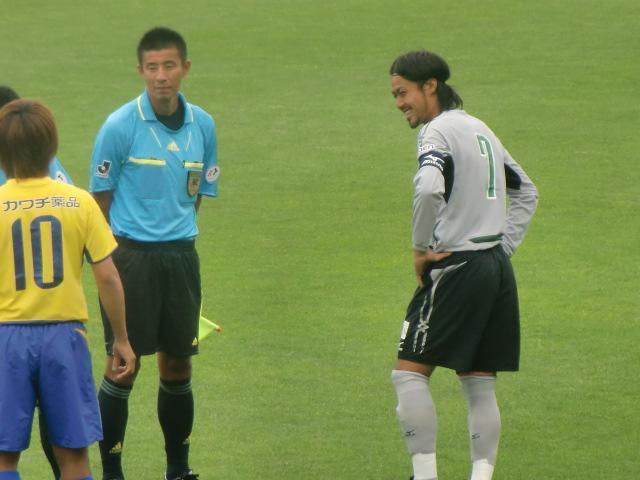 キックオフ前のポニョマサ&菅選手、主将同士の挨拶