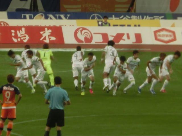 神谷選手のフリーキックからバイア選手が頭で合わせて湘南先制!