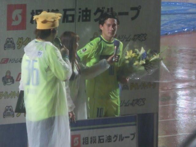 マンオブザマッチの表彰式へとゴール裏サポーター席に走ってきた菊池選手とさちえさん。