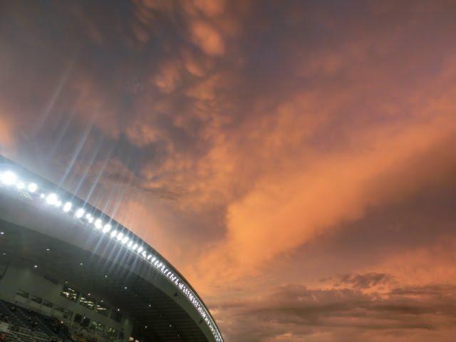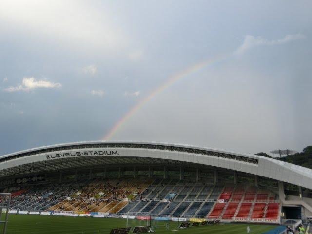 雷雨が去り、虹がかかったスタジアム♪