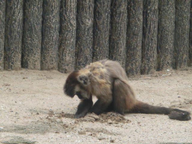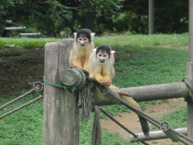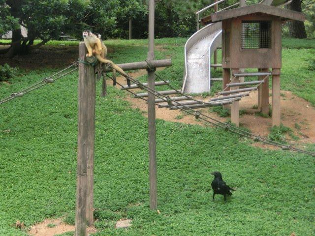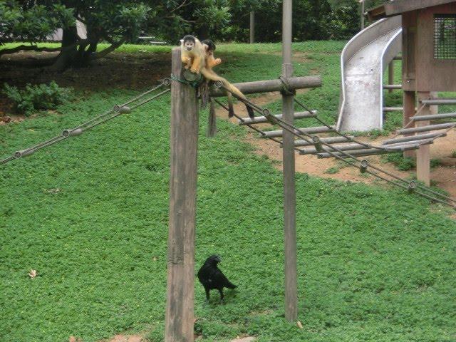 リスザルの下でずっとエサのおこぼれを待つカラスや