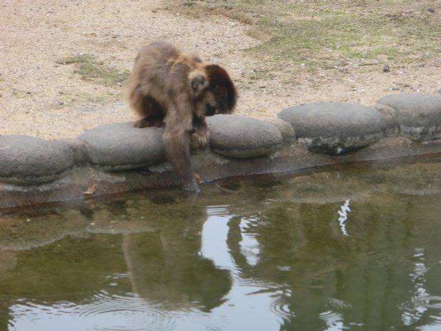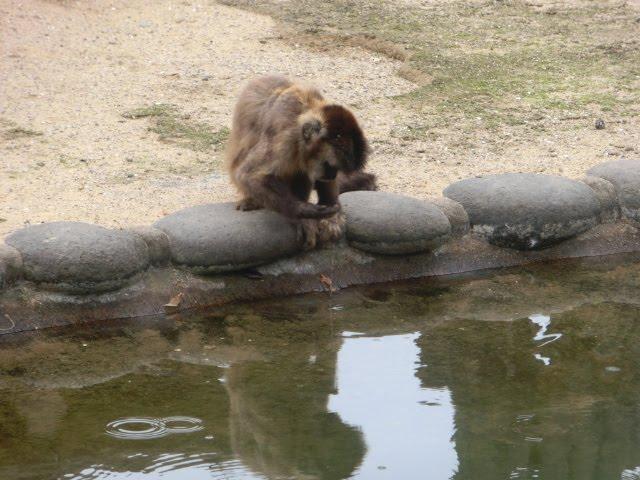 餌があるかもしれないと池の水に手を伸ばして探す猿や