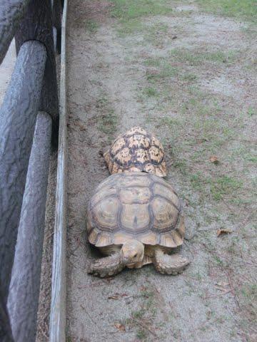 (ずんずん歩いていった小亀が、前に止まって休んでいた大亀にぶつかり、甲羅がごつん。追い付かれた大亀は小亀を引き離すように慌てて速足で前へ)