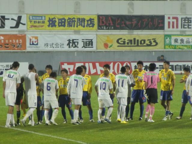 自分たちのホ-ムで相手の昇格を阻止できなかった無念さを抱えながらも、しっかりと握手する栃木の選手たち