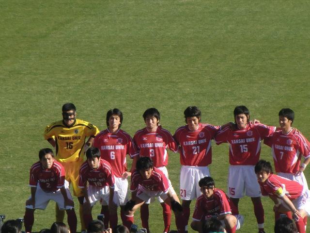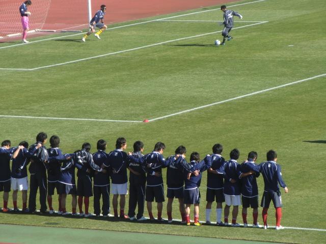 こちらは試合前のアップでピッチに入る前。肩を組む関西大。