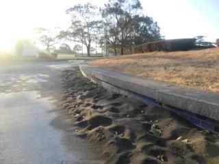 高城運動公園に積もった火山灰