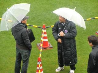 秋田さんの向かい側でもう一人傘さしてるのが柏レイソルで活躍した片野坂さんです♪