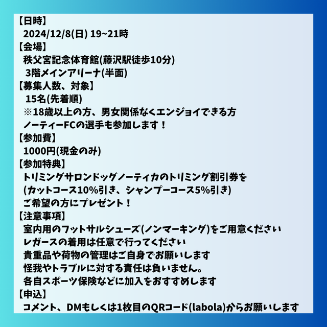 ※18歳以上の方、男女関係なくエンジョイできる方 ノーティーFCの選手も参加します!