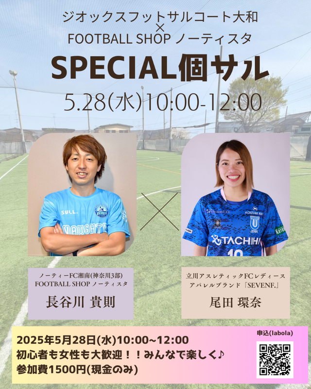 5月28日(水)10:00〜12:00、ジオックスフットサルコート大和にて、スペシャルゲストを迎えた個人参加型フットサルイベントを開催します⚽