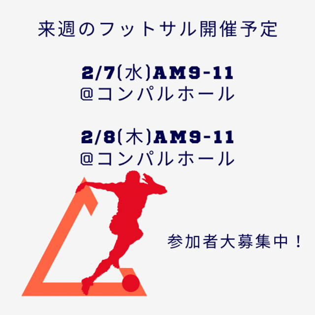 私たちと共にフットサルで汗を流し、楽しんでいただける仲間を広く募集しています。 練習は、毎週水曜日の午前10時から11時までが基本で、ほとんど初心者のの方ばかりで楽しく汗を流しています。フットサルを楽しみたい方、日頃の運動不足気になっている方などのご参加をお待ちしております。 1.参加資格 ・初心者、女性の方、学生さん大歓迎! ・経験者も大歓迎ですが、みんなが楽しめる配慮をお願いします。 ...もっと見る