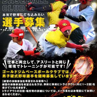 ゴールドジムベースボールクラブでは、 男子硬式野球選手を随時募集しています。 【練習の体験参加を希望される皆様へ】 練習の体験参加を希望される方は、事前に事前にトライアウト(月に1~2回)を受けていただきます。 トライアウトの日程・場所等の詳細については、気軽にお問い合わせください。