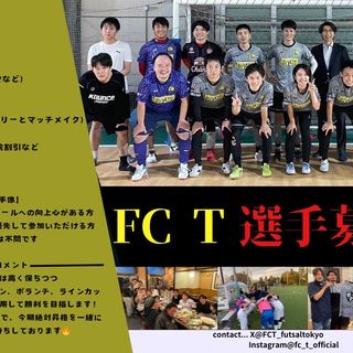 東京都4部リーグ FC Tです! 関東で競技個サル、競技リーグ、ワンデイ大会などを運営しているTF代表ツンタが 運営、監督、代表を、務める社会人フットサルチームです! 活動エリアは東京都東側が、メイン 【メンバー構成】 (20代後半~40代まで在籍しております。メインは30代前半) 監督 新谷 明(ツンタ、フットサルC級ライセンス所持) マネージャー